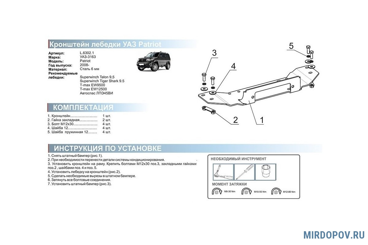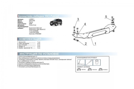 Кронштейн лебедки в штатный бампер (установка за номер) Уаз Патриот (2005-2021) № L.6302.1